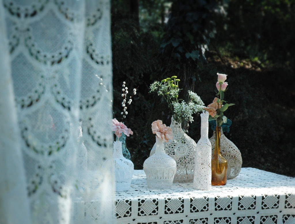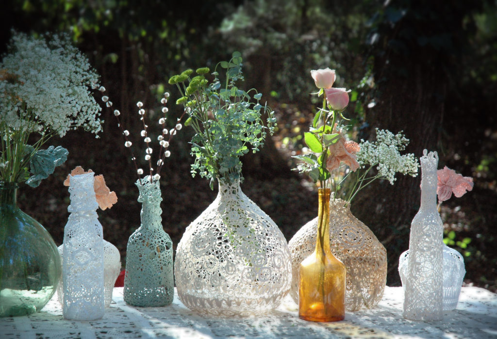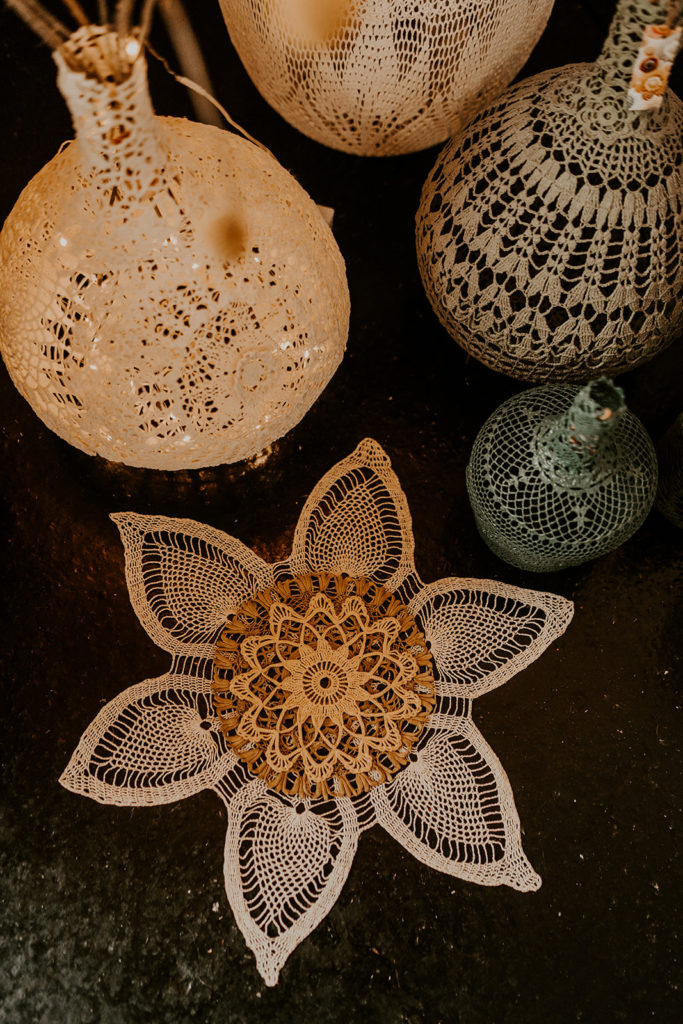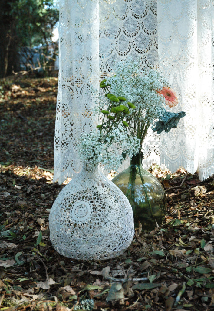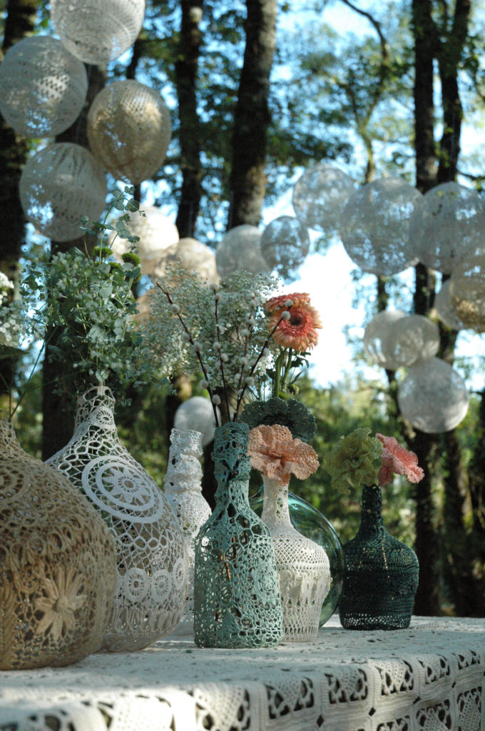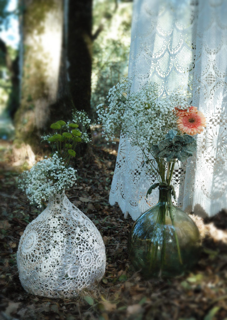 Les Dame-jeanne dentelle maillO design sont des sculptures, des objets d’art, des décorations textiles, des créations uniques faites à la main dans mon atelier en France. Elles sont réalisées à partir de napperons crochet anciens, recyclés, modelés sur les dames-jeannes en verre, durcis et peints. Elles s’exposent en décoration unique ou en composition, Elles se marient à merveilles avec les bouquets de fleurs séchées et les petites guirlandes led pour un esprit photophores très poétique. Elle existent en plusieurs taille, disponible à l’achat et à la location pour la décoration des salons, évènement ainsi que vos fêtes: mariages, anniversaire, EVJF, saint Valentin, lancement de produit… Elles attirent l’attention et subliment les vitrines des boutiques et restaurants. La galerie de photos ci-dessous pour vous inspirer.